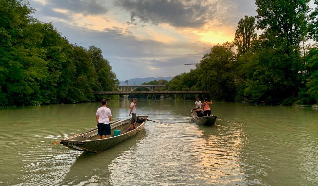 La navigation en barque Ă fond plat sur le RhĂŽne et le Lac LĂ©man remonte bien au Moyen-Age, mais probablement mĂȘme au temps des romains. Aujourdâhui, la SociĂ©tĂ© des Pontonniers de GenĂšve est une association sportive qui maintient cette tradition et propose des activitĂ©s variĂ©es pendant toute lâannĂ©e. Nous nous entraĂźnons toutes les semaines Ă remonter le RhĂŽne Ă la gaffe et Ă le traverser Ă la rame. Nous proposons des cours pour les jeunes et moins jeunes entre juin et septembre pour leur faire dĂ©couvrir ce sport nautique dans un paysage unique, au cĆur de GenĂšve. Venez ramer avec nous! Câest du paddle Ă ancienneâŠ.