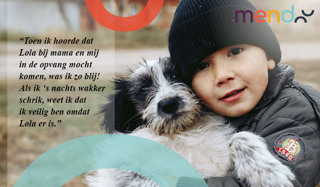 "Toen ik hoorde dat Lola bij mama en mij in de vrouwenopvang mocht komen, was ik zo blij! Als ik 's nachts wakker schrik, weet ik dat ik veilig ben omdat Lola er is". Stichting Mendoo biedt hulp aan slachtoffers van huiselijk geweld en hun huisdieren. Vaak vormt het huisdier een belemmering om de stap te zetten naar hulp. Mendoo stimuleert en begeleidt opvanglocaties voor slachtoffers van huiselijk geweld om huisdieren toe te laten. Zodat het gezin, inclusief de dieren, bij elkaar kan blijven! Zo zijn sinds 2014 al honderden slachtoffers van huiselijk geweld én hun huisdieren in veiligheid gebracht. Helpt u mee?
